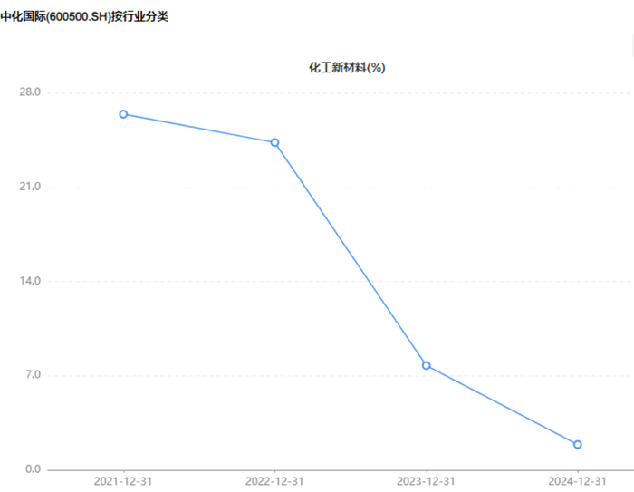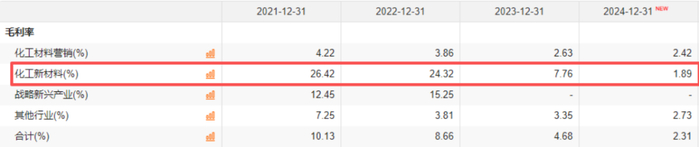 看到这,肯定会有老铁问,既然转型看上去效果还不错,为啥还亏成这样了。答案是主要产品的价格持续下滑,2024年为例,化工新材料业务毛利率只有1.89%,而2021年一度高达26.42%。当前的毛利率甚至要比贸易业务还低。