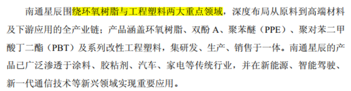 南通星辰是国内环氧树脂和工程塑料领域头部企业,掌握了聚苯醚(PPE)和聚对苯二甲酸丁二酯(PBT)技术,其PPE产能位居国内首位、全球第二,改性PBT、改性PPE等改性工程塑料产品也居国内前列。