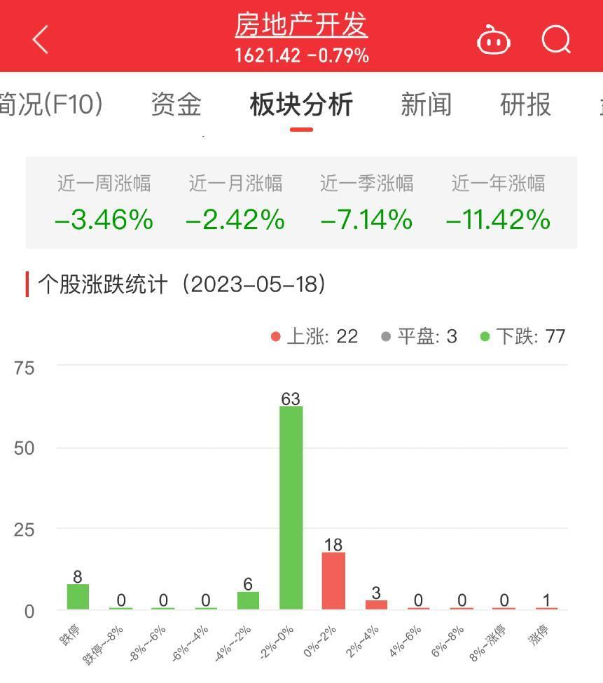 中国经济网北京5月18日讯 今日,房地产开发板块整体跌幅0.79%,其中22只股票上涨,3只股票平盘,77只股票下跌。