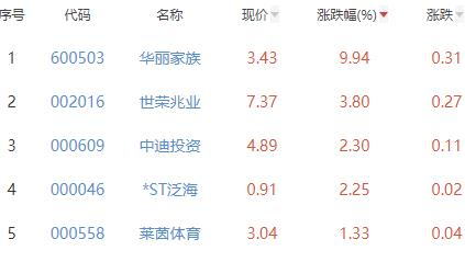 其中,华丽家族、世荣兆业、中迪投资、*ST泛海、莱茵体育位列板块涨幅前五位,涨幅分别为9.94%、3.80%、2.30%、2.25%、1.33%。