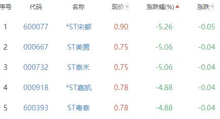 *ST宋都、ST美置、ST泰禾、*ST嘉凯、ST粤泰位列涨幅榜后五位,涨幅分别为-5.26%、-5.06%、-5.06%、-4.88%、-4.88%。