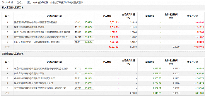 具体来看,知名游资现身龙虎榜,宁波桑田路(国盛证券宁波桑田路证券营业部)、国泰君安证券总部分别买入3631.93万元、2516.23万元;东方财富证券拉萨金融城南环路证券营业部、国泰君安证券总部分别卖出1636.88万元、1499.53万元。