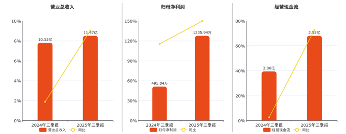 公司营业总收入为11.47亿元,较去年同报告期营业总收入增加9510.29万元,实现5年连续上涨,同比较去年同期上涨9.04%。归母净利润为1235.94万元,较去年同报告期归母净利润增加740.90万元,实现2年连续上涨,同比较去年同期上涨149.66%。经营活动现金净流入为3.55亿元,较去年同报告期经营活动现金净流入增加1.49亿元,实现3年连续上涨,同比较去年同期上涨72.55%。