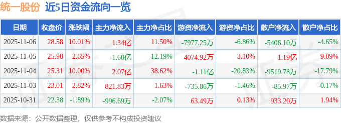 证券之星消息,统一股份11月6日涨停收盘,收盘价28.58元。该股于14点32分涨停,未打开涨停,截止收盘封单资金为1.3亿元,占其流通市值3.09%。