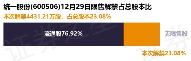 统一股份(600506)4431.21万股限售股将于12月29日解禁,占总股本23.08%