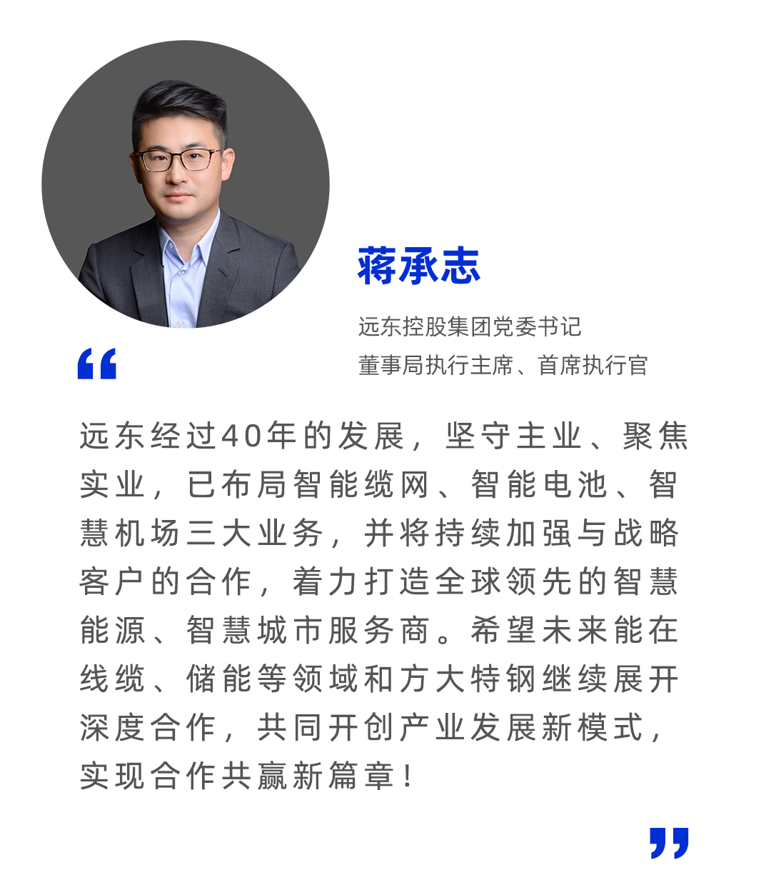3月20日,远东控股集团党委书记、董事局执行主席、首席执行官蒋承志率队拜访方大特钢科技股份有限公司(以下简称“方大特钢”),方大特钢董事长梁建国热情接待并座谈。