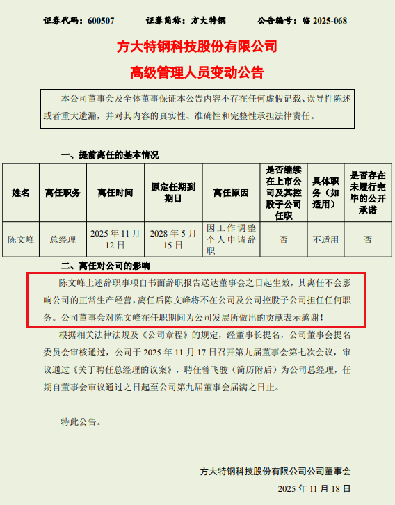 2025年11月18日,方大特钢公告,因工作调动,陈文峰先生不再担任总经理职务。