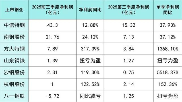 在钢铁行业“稳增长、防内卷”的政策框架下,2025年三季度特钢板块交出超预期答卷。多家上市钢企顶住行业价格下行压力,实现盈利大幅修复,其中以方大特钢、沙钢股份的三季度净利润反弹最为突出。