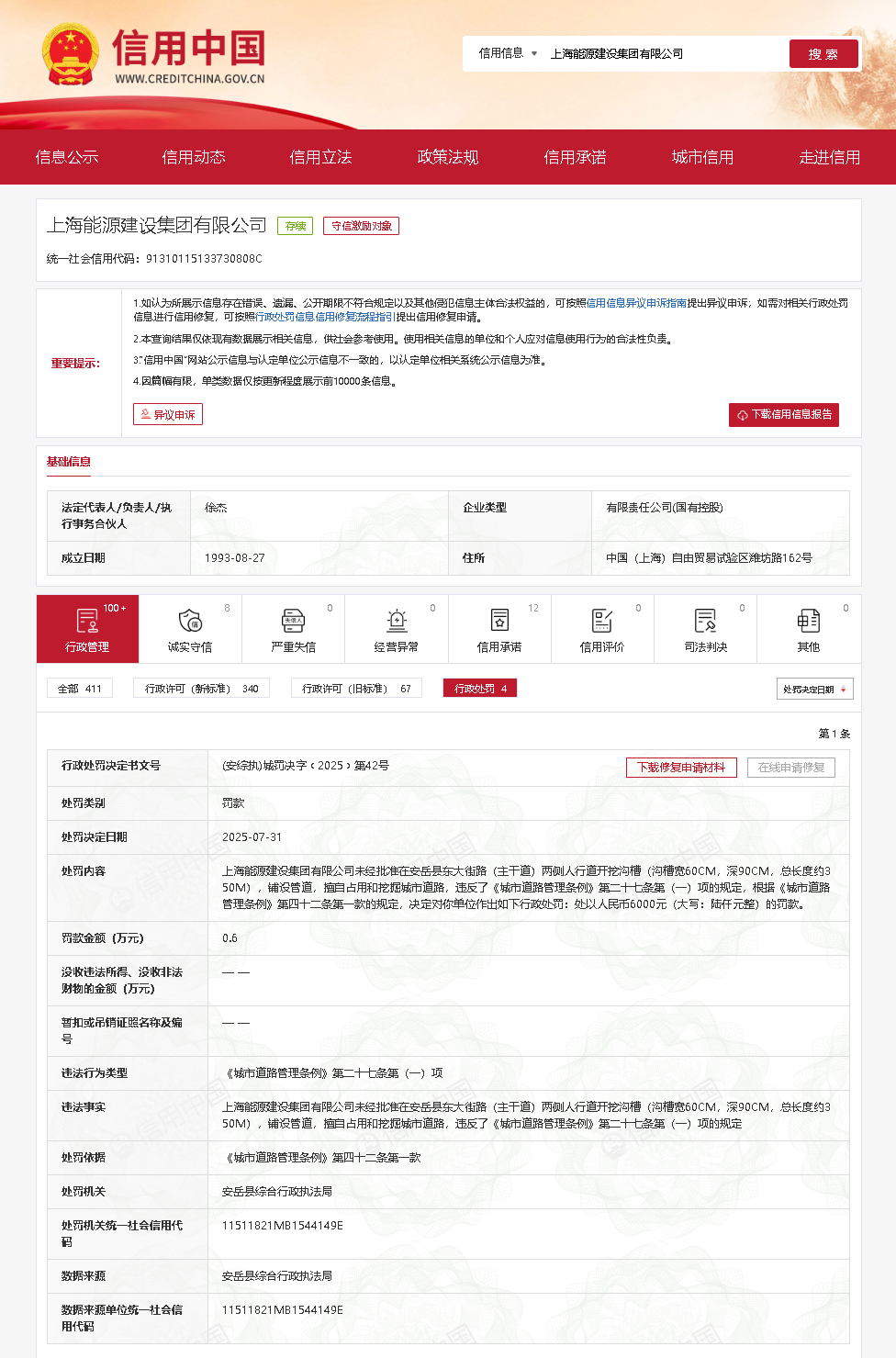 近日,记者从信用中国获悉,上海能源建设集团有限公司未经批准在安岳县东大街路(主干道)两侧人行道开挖沟槽(沟槽宽60CM,深90CM,总长度约350M),铺设管道,擅自占用和挖掘城市道路,违反了《城市道路管理条例》第二十七条第(一)项的规定,根据《城市道路管理条例》第四十二条第一款的规定,决定对你单位作出如下行政处罚:处以人民币6000元(大写:陆仟元整)的罚款。