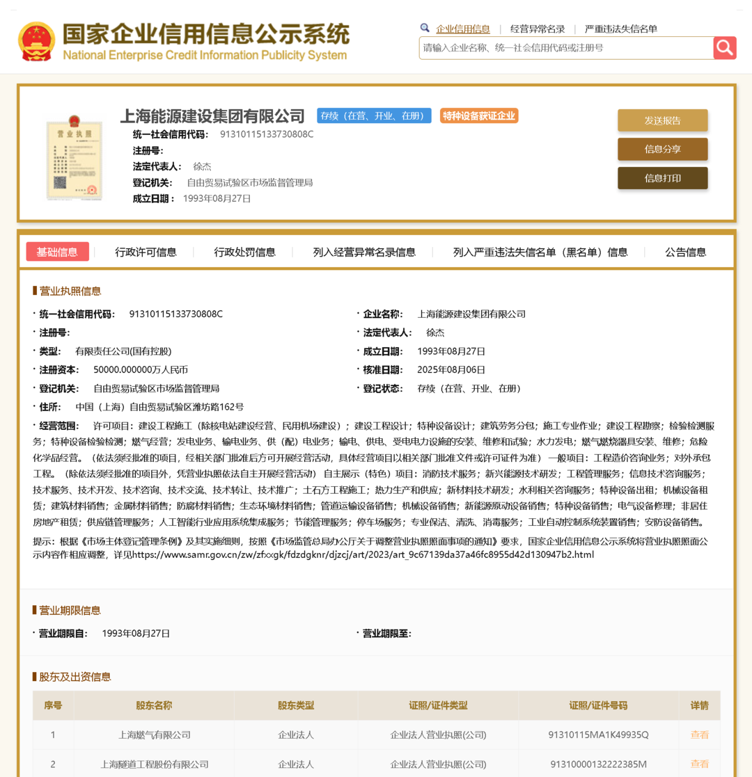 公开信息显示,上海能源建设集团有限公司成立于1993年8月27日,法定代表人徐杰,股东为上海燃气有限公司和上海隧道工程股份有限公司(隧道股份 600820)。