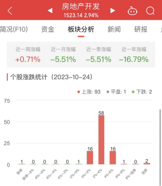 中国经济网北京10月24日讯今日,房地产开发板块整体涨幅2.94%,其中93只股票上涨,1只股票平盘,2只股票下跌。