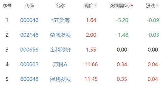 *ST泛海、荣盛发展、金科股份、万科A、保利发展位列板块涨幅榜后五位,涨幅分别为-5.20%、-1.48%、0.00%、0.34%、0.35%。
