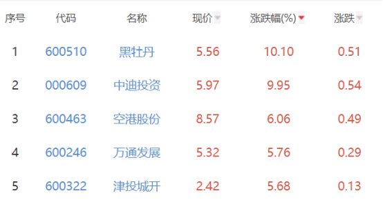其中,黑牡丹、中迪投资、空港股份、万通发展、津投城开位列板块涨幅榜前五位,涨幅分别为10.10%、9.95%、6.06%、5.76%、5.68%。