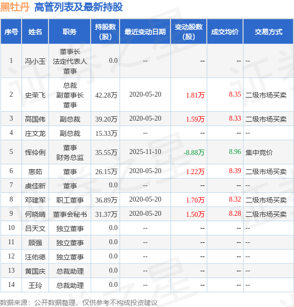 黑牡丹的高管列表及最新持股情况如下: