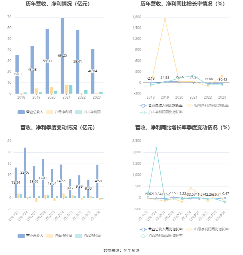 2023年,公司毛利率为10.22%,同比下降2.79个百分点;净利率为0.87%,较上年同期下降0.69个百分点。从单季度指标来看,2023年第四季度公司毛利率为9.91%,同比下降1.55个百分点,环比上升4.82个百分点;净利率为-7.77%,较上年同期下降21.26个百分点,较上一季度下降18.42个百分点。