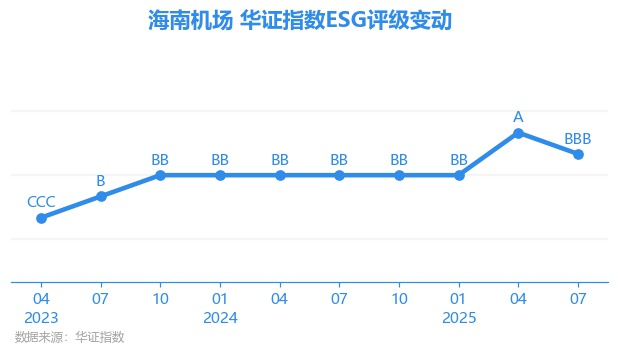 日前,华证指数公布了新一期(2025年7月31日)的ESG评级结果,海南机场(600515.SH)获得BBB评级(华证指数评级为C起至AAA九档,C为最低档,AAA为其最高一级评级/AA为其第二档),上一期(2025年4月30日)ESG评级为A。本期ESG评级在102家房地产管理和开发行业A股上市公司中排名第22(上一期排名第18)。