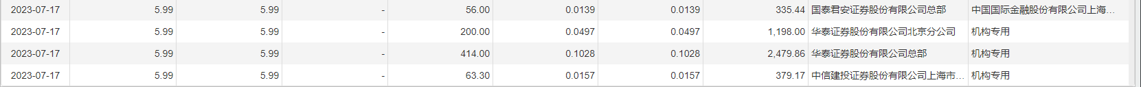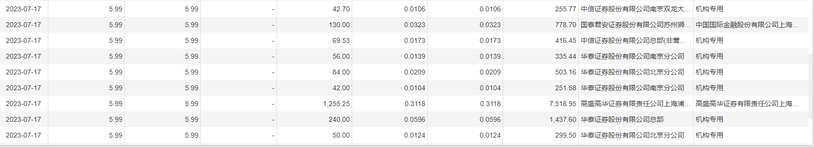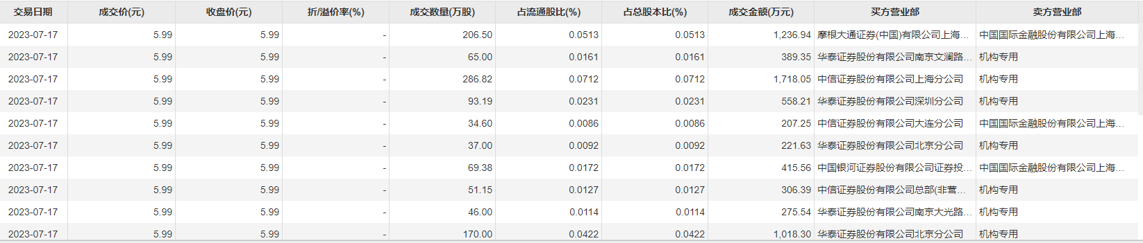 7月17日大宗交易成交3762.42万股,成交额2.25亿元,占当日总成交额的23.51%,成交价5.99元,较市场收盘价5.99元持平。