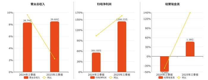 公司营业总收入为39.60亿元,在已披露的同业公司中排名第15,较去年同报告期营业总收入增加8604.52万元,实现3年连续上涨,同比较去年同期上涨2.22%。归母净利润为1308.23万元,较去年同报告期归母净利润增加806.68万元,实现5年连续上涨,同比较去年同期上涨160.84%。经营活动现金净流入为1.38亿元,较去年同报告期经营活动现金净流入增加4.88亿元。