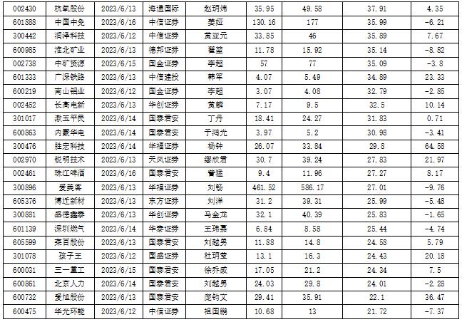 本周A股明显走强,截至周五收盘,沪指一周涨1.3%,收报3273.33点;深证成指一周涨4.75%,收报11306.53点;创业板指一周涨5.93%,收报2270.06点。市况好转背景下,机构研究员的动向如何呢?投资快报投研通统计显示,(6月12日至6月17日)券商研究员对67家公司的投资评级和目标价进行“再评估”。给出具体目标价的公司中,44家公司的收盘价距券商研究员给出的目标价还有逾20%的向上空间。