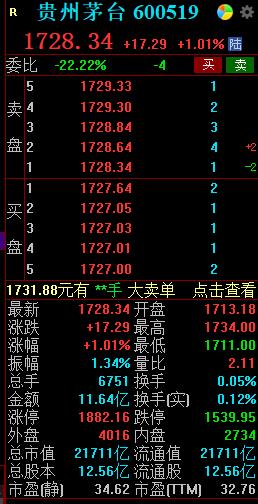 6月28日,贵州茅台高开高走,截至发稿,该股涨超1%,报1728.34元。