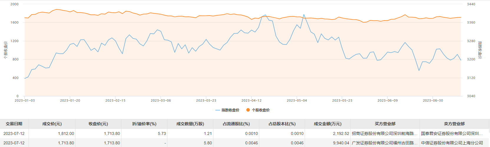贵州茅台7月12日大宗交易成交7.01万股,成交额1.21亿元,占当日总成交额的5.05%,成交均价1730.75元,较市场收盘价1713.8元溢价0.99%,其中最高成交价1812元,最低成交价1713.8元。