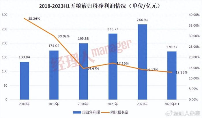 拉长时间维度来看,2018年-2022年,五粮液实现营业收入400.30亿元、501.18亿元、573.21亿元、662.09亿元、739.69亿元,同比增长率分别为32.61%、25.20%、14.37%、15.51%、11.72%,整体呈现下滑趋势;同期归母净利润分别为133.84亿元、174.02亿元、199.55亿元、233.77亿元、266.91亿元,同比增长率分别为38.26%、30.02%、14.67%、17.15%、14.17%,同样呈现整体下滑趋势。