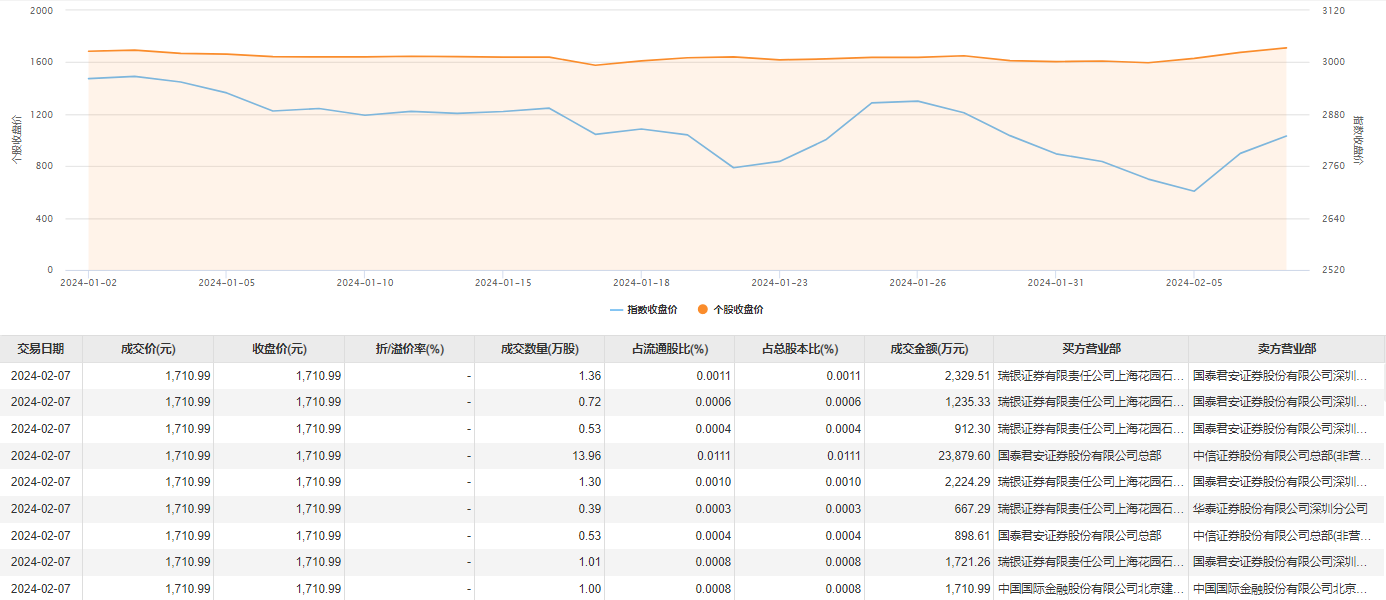 2月7日大宗交易成交20.8万股,成交额3.56亿元,占当日总成交额的3.84%,成交价1710.54元,较市场收盘价折价0.03%。