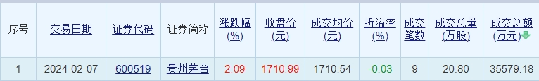 2月7日大宗交易成交20.8万股,成交额3.56亿元,成交价1710.54元,较市场收盘价折价0.03%。