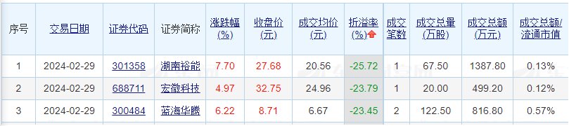 成交价方面,立讯精密、*ST金一溢价率居前,溢价率依次为0.87%、0.4%;湖南裕能、宏微科技、蓝海华腾折价率居前,折价率依次为25.72%、23.79%、23.45%。