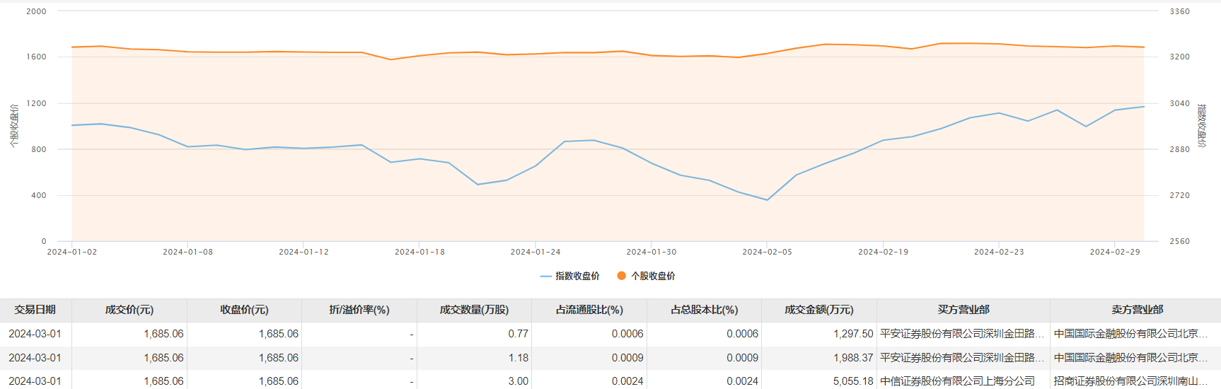 3月1日大宗交易成交4.95万股,成交额8341.05万元,占当日总成交额的1.81%,成交价1685.06元,较市场收盘价1685.06元持平。