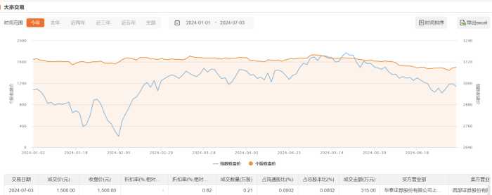 今日大宗交易成交2100股,成交额315万元,占当日总成交额的0.07%,成交价1500元,较市场收盘价持平。