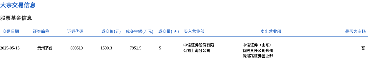 贵州茅台今日大宗交易平价成交5万股,成交额7951.5万元