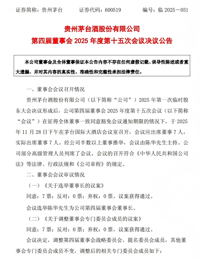 据贵州茅台消息,11月28日晚间,贵州茅台酒股份有限公司(简称贵州茅台)发布公告,公司于28日下午召开第四届董事会2025年度第十五次会议,审议通过《关于选举董事长的议案》,选举陈华为公司第四届董事会董事长。