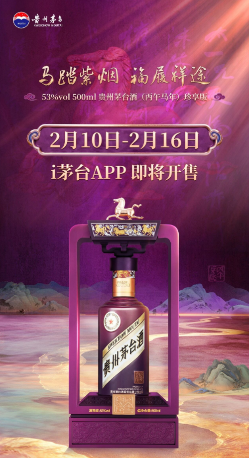 53%vol 500ml贵州茅台酒(丙午马年)珍享版,将于2月10日-2月16日每日09:00开售,售完即止。