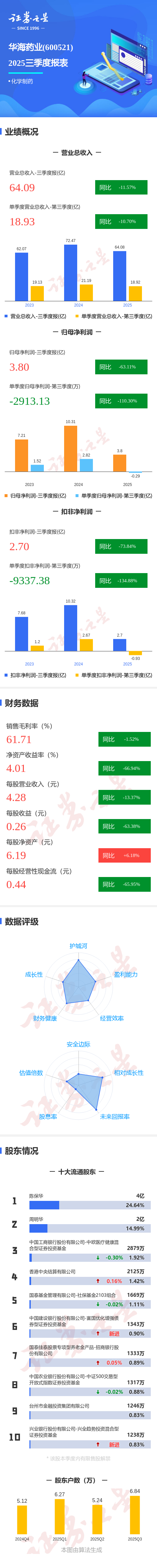 图解华海药业三季报:第三季度单季净利润同比下降110.30%