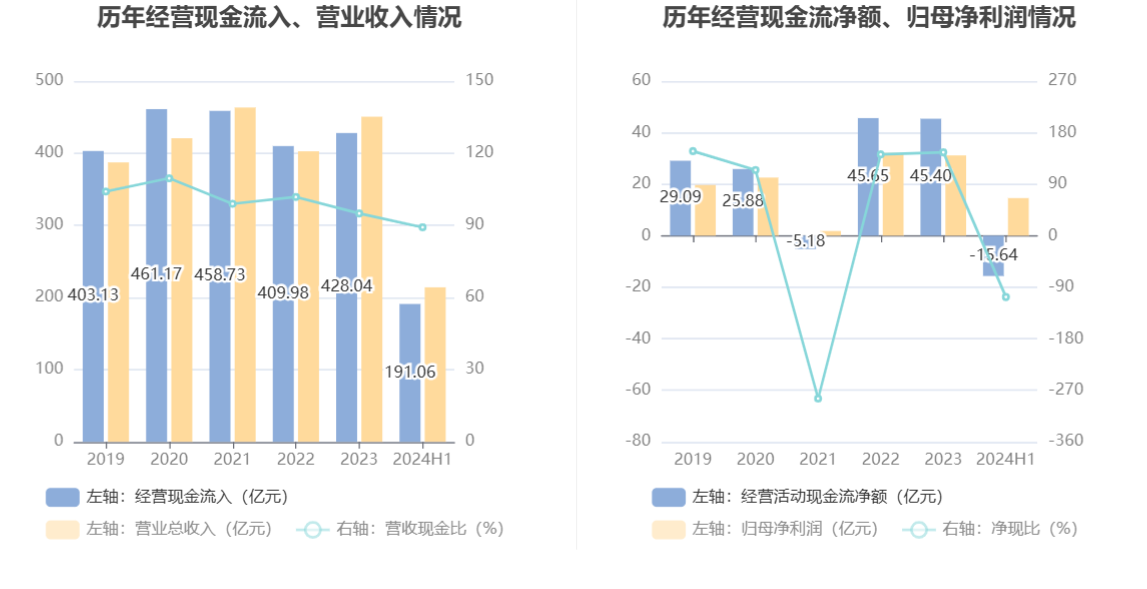 2024年上半年,公司营业收入现金比为89.22%,净现比为-107.11%。