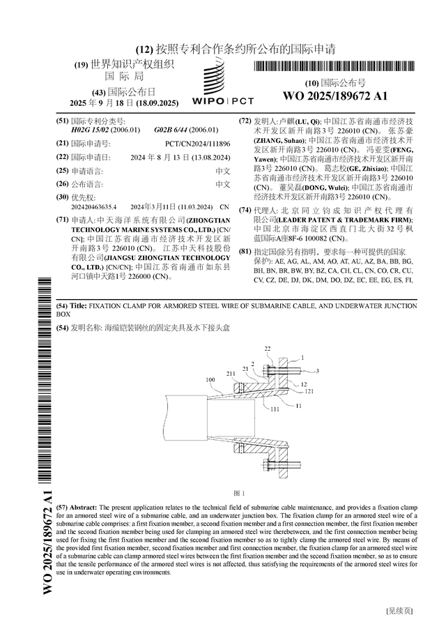 中天科技公布国际专利申请:“海缆铠装钢丝的固定夹具及水下接头盒”