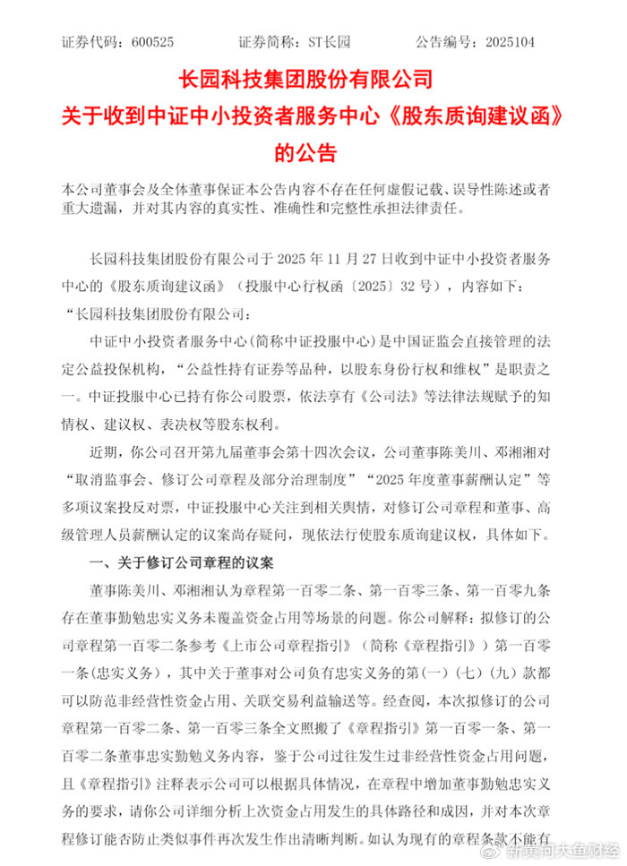 根据ST长园(600525.SH)最新公告,公司于11月27日收到中证中小投资者服务中心《股东质询建议函》,针对其拟修订公司章程取消监事会、删除关联股东回避表决规则,以及2025年度董事、高管薪酬同比上涨49.8%等事项提出质询。