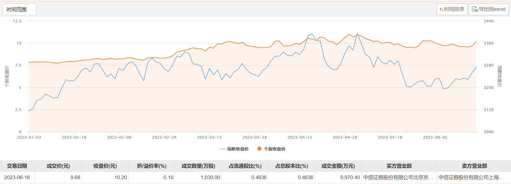 中铁工业今日大宗交易折价成交1030万股,成交额9970.4万元