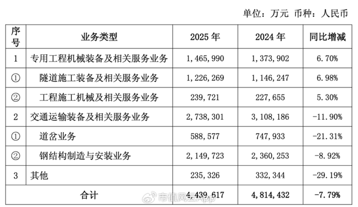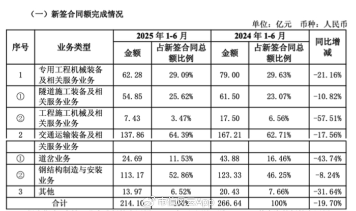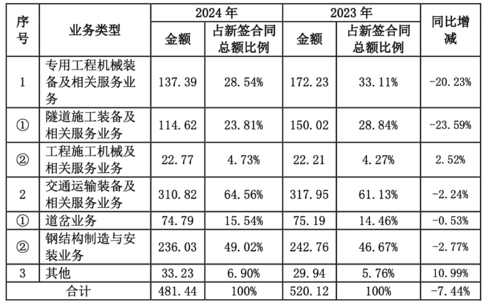 2024年新签合同显示,公司有两大业务——专用工程机械设备和交通运输设备,其中属于专用工程机械设备的隧道施工装备新签合同金额下滑是最明显的,同比下降了23.59%。