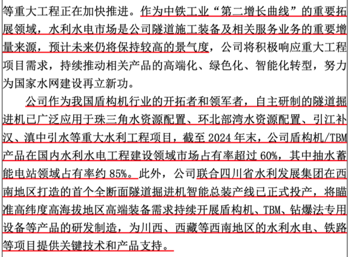 公司在投资者交流上透露,盾构机/TBM产品在国内水利水电工程建设领域市场占有率超过60%,其中抽水蓄能电站领域占有率约85%,水利水电市场将成为公司的“第二增长曲线”的重要拓展领域。