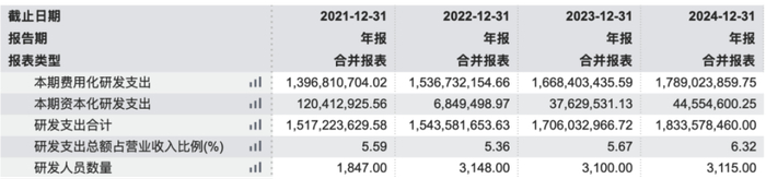 2022年-2024年研发投入逐年增加,分别为14.43亿、17.06亿、18.33亿,占当期营业收入比例为5.36%、5.67%、6.32%。