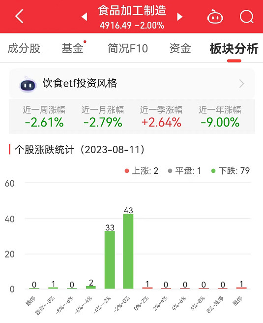 数据显示,截至今日,食品加工制造板块近一周涨幅-2.61%,近一月涨幅-2.79%,近一季涨幅2.64%。