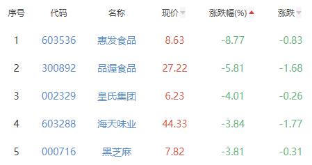 惠发食品、品渥食品、皇氏集团、海天味业、黑芝麻位列涨幅榜后五位,涨幅分别为-8.77%、-5.81%、-4.01%、-3.84%、-3.81%。