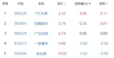 其中,*ST交昂、佳隆股份、广弘控股、一致魔芋、金达威位列板块涨幅前五位,涨幅分别为4.98%、0.36%、0.00%、-0.40%、-0.42%。