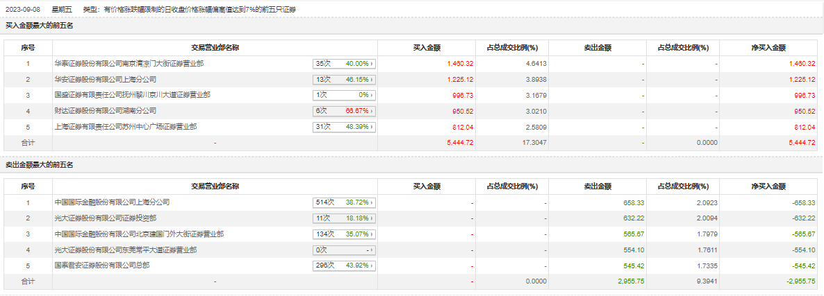具体来看,华泰证券南京清凉门大街证券营业部、华安证券上海分公司分别买入1460.32万元、1225.12万元;中国国际金融上海分公司、光大证券证券投资部分别卖出658.33万元、632.22万元。