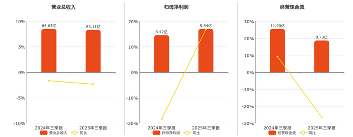 公司营业总收入为63.11亿元。归母净利润为9.84亿元,较去年同报告期归母净利润增加1.42亿元,同比较去年同期上涨16.88%。经营活动现金净流入为8.73亿元。