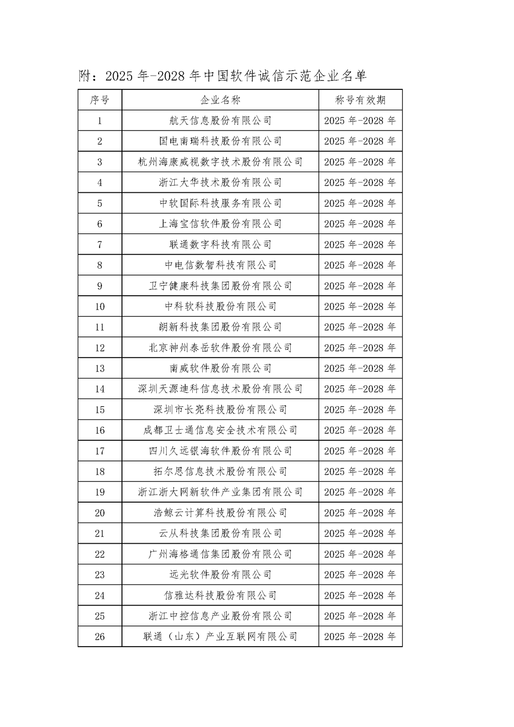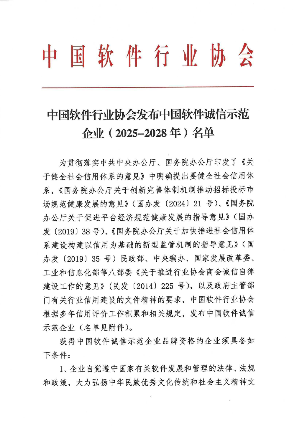 中国软件行业协会发布中国软件诚信示范企业(2025-2028年)名单
