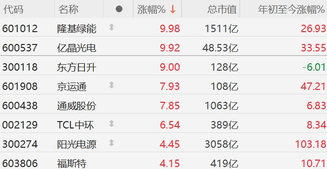 格隆汇10月14日|A股市场光伏股集体走强,其中,隆基绿能、亿晶光电涨停,京运通一度涨停,东方日升涨9%,通威股份涨超7%,TCL中环涨超6%,阳光电源、福斯特涨超4%。