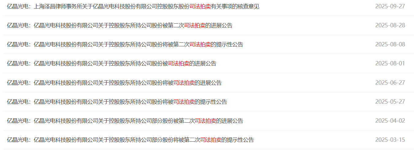 亿晶光电原控股股东股权在经历多次司法拍卖后,最终不再持有公司股份,公司也陷入了无实控人的状态。在2025年9月27日,亿晶光电发布了公司控股股东、实控人变更的公告,变为无实控人状态。